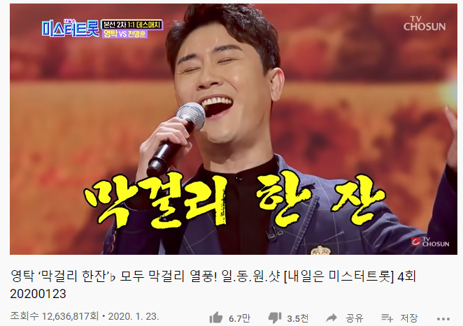 영탁의 막걸리 한잔 영상은 무려 1200만뷰가 넘었는데요. 역시 이때부터 우승후보로 급 상승 했던거 같아요.