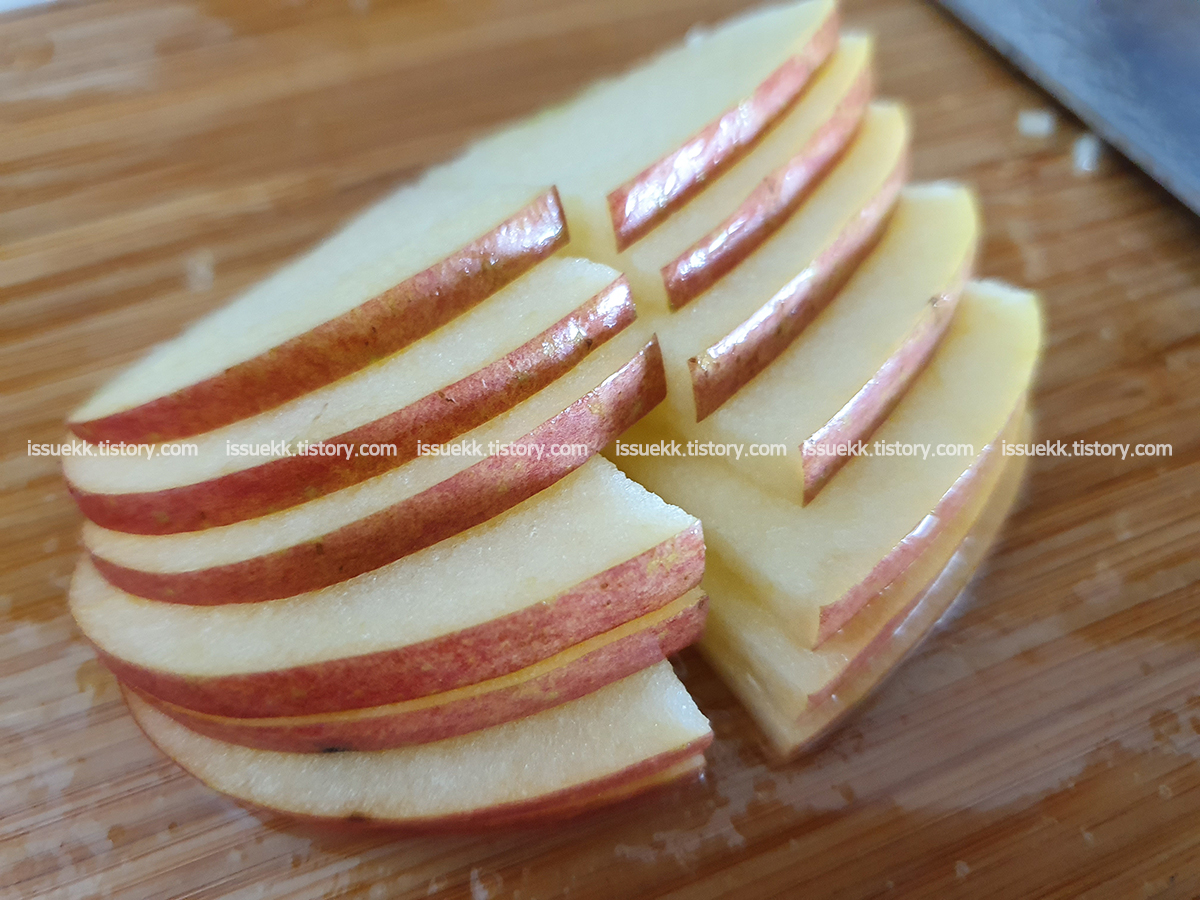 사과는 씨를 제거하고 사진과 같이 얇게 썰어주세요. 너무 얇게는 하실필요는 없으세요. 샹그리아를 마시면서 과일을 함께 먹을거라면 살짝 좀더 두꺼워도 괜찮아요.