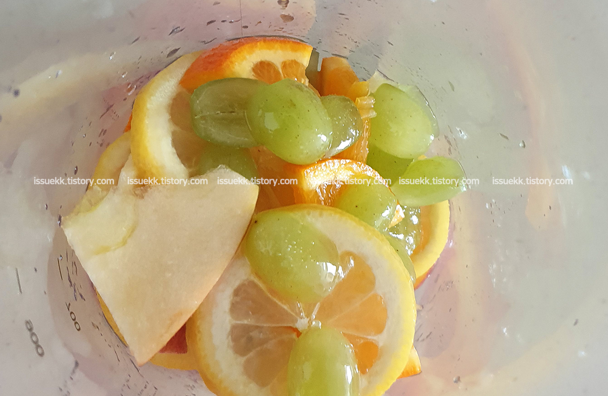 이날은 저는 달달한 청포도도 좋아해서 넣어봤어요. 포도를 넣을땐 반으로 컷팅해서 넣어주세요.