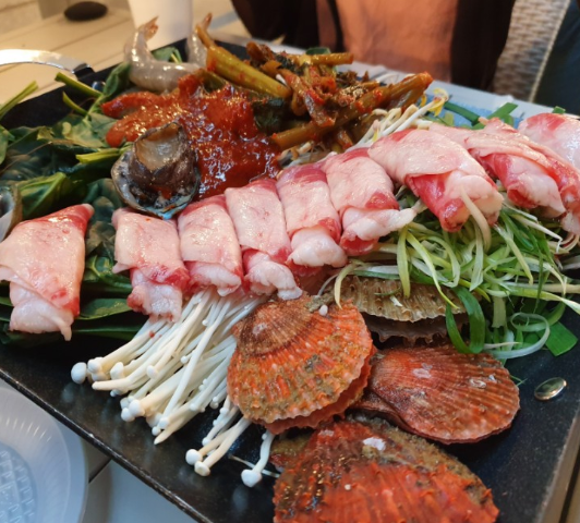 캬 비주얼 장난 아니죠?! 차돌박이와 함께 가리비, 팽이버섯, 전복, 새우등 정말 싱싱한 해산물들과 함께 나와서 잘 왔단 생각이 들더라고요. 가리비나 전복이 각각 4개씩 나와서 이 정도 양이면 4인이 적당한 거 같아요.