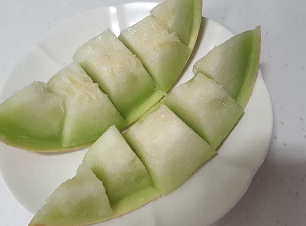 멜론 먹는 법은 간단합니다. 먼저 깨끗하게 껍질을 씻어준 후에 반으로 나눠주세요. 그리고 반으로 나눠진 멜론은 다시 반으로 나누면 1/4 덩이가 됩니다. 그리고 이걸 한 번 더 잘라 1/8조각으로 만든 후 씨앗만 제거하고 껍질을 얇게 깎아줍니다. 그리고 껍질을 버리지 않고 그위에 속살을 얹어 칼집을 내 한입에 넣기 좋게 썰어주세요. 이렇게 하면 멜론 예쁘게 자르는 법이 끝난답니다. 하지만 저는 이날 하니원 멜론을 예쁘게 잘라먹으려 했는데 뜻대로 되지 않는 날이었어요. 사진 속에선 좀 못났으니 이해해주세요!