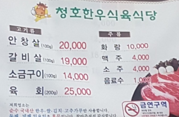 가격은 소고기 100g 기준으로 나옵니다. 안창살과 갈빗살이 대표 메뉴라고 할 수 있어요. 저희는 안창살보다는 갈빗살을 더좋아해서 갈때 갈비살을 주문합니다. 100g 기준이 이니 적당히 먹고 오신다면 약 1인당 1.5~2인분을 시키면 적당 할듯합니다. 한우다 보니 가격대는 싼 편은 아니지만 서울이나 소고기가 맛있는 집이랑 비교했을 땐 가격은 적당 한듯합니다.