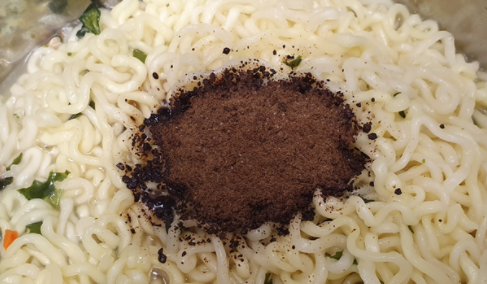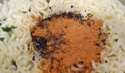 너구리 라면수프는 1/2정도 양을 넣고 젓가락으로 저어가며 수프가 면에 스며들도록 합니다.