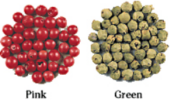 후추나무가 아닌 다른 열매로 붉은 열매가 완숙 때까지 기다렸다 수확후 삶아 소금에 절인 것입니다. 맛 · 향기도 부드러운 때문에 어떤 요리에도 잘 맞고 그린 후추와 마찬가지로 양념 보다는 아니라 장식으로 사용됩니다.